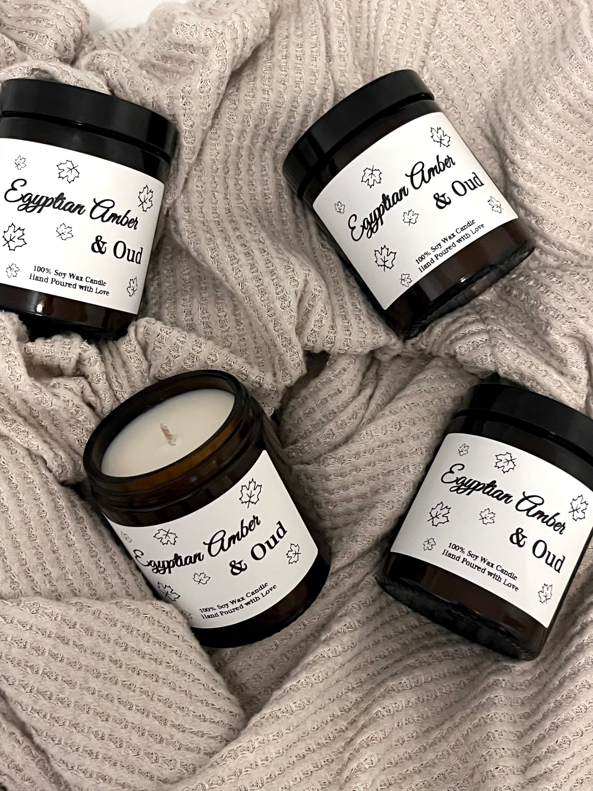 Elevate your environment with our Egyptian Amber & Oud Candle. Hand- poured with a blend of natural soy wax and high quality essential and fragrance oils, this candle offers a captivating aroma, creating a rich and luxurious atmosphere.